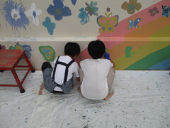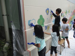 虹に浮かぶのは、開校90周年記念キャラクターの『あおむう』と『ちょうか』。この周りに、こどもたちが、花や蝶を描きました。ペンキで描くのは初めて!という子たちがほとんどでしたが、自由な発想で花や蝶を描いていました。全校児童で協力して描き上げた、すばらしい壁画が完成しました!!