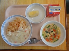 えびクリームライス 牛乳 洋風卵スープ 果物(りんご)