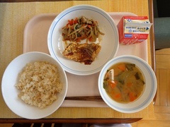 こぎつねごはん 牛乳 魚のから揚げ変わりソースかけ こんにゃくのチャプチェ風炒め みそ汁