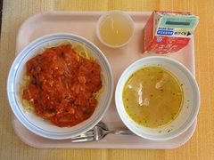 鶏肉とほうれん草のトマトスパゲッティ 牛乳 ジュリエンヌスープ アップルゼリー