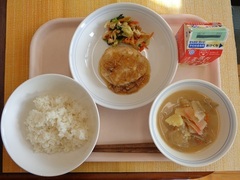 今日の給食では、豆腐を使ったハンバーグを作りました。きのこのソースもかかってうまみたっぷりです。