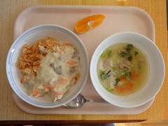 中華丼 牛乳 青菜と卵のスープ 果物(王林)