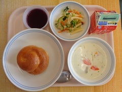 キャロットライスのクリームソースかけ 牛乳 フレンチサラダ 野菜スープ