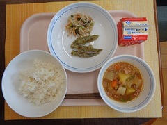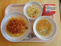 ミートソーススパゲッティ 牛乳 チーズサラダ ジュリエンヌスープ