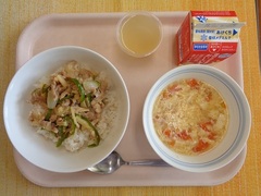 チンジャオロース丼 牛乳 トマトと卵のスープ アップルゼリー