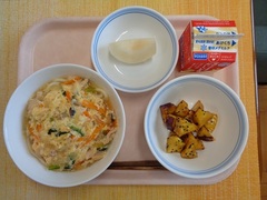 鶏肉と野菜の卵とじうどん 牛乳 大学芋 なし