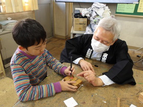講話の後は、自分の名前の一文字を石に彫って自分のはんこを作りました。職人さんに「上手だね」と褒められ、嬉しそうなこどもたちも。世界に一つの自分だけのはんこを手に、大満足のこどもたちでした。