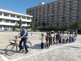 次に、校庭に設置した疑似道路を歩き、道路上にある危ない場所の確認をしました。その後、お家から持参した自分の自転車に乗りました。信号があるところでは、一時停止し、青信号になっても、左右前後を確認してから走り出すようにして、安全に自転車に乗ることができました。