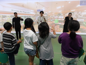 授業の活動は「オリジナルピザとオリジナルパフェを買いに行こう」でした。店員役の担任や外国語学習指導員に、英語で話しかけ、見事全員、材料を買うことができました。