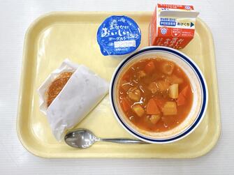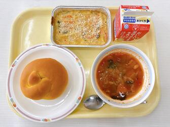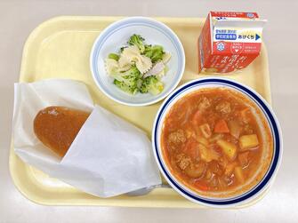 今日はボリュームはありますが、こどもたちがよく食べるメニューです。1年生は、ミルクプリンの上のいちごソースを見て「これはなに?」「いちご?」と恐る恐る食べていました。