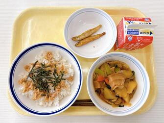 今日は春が旬の野菜をたっぷり使った献立です。新たけのこは、鹿児島県産の採れたてのものを使用しています。みそ汁には、春キャベツや新玉ねぎ、新じゃがいも、スナップエンドウが入っています。魚はこどもたちには少し辛かったようですが、よく食べてくれていました。