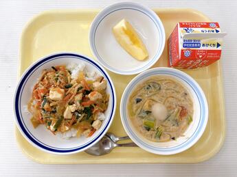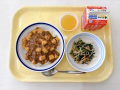 今日の麻婆豆腐丼は冷凍豆腐を使用しています。国産大豆使用で消泡剤不使用、なめらかな絹ごし食感で食べやすいです。いままで崩れにくい木綿豆腐を使用していましたが、冷凍豆腐は絹でも崩れにくいため、新たに採用することとしました。「このお豆腐、いつもと違う。」と気づいている児童もいて、「どう?」とたずねると「おいしい。」と好評でした。