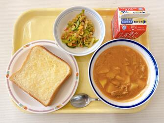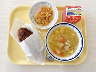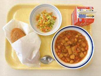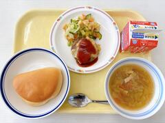 今日は減塩献立です。パンは塩分量が多いため(1個当たり0.7g)、パンの献立は塩分量が多くなりがちです。トマトの酸味やチップスの香ばしさで塩分が少なくてもおいしく食べられるように工夫しています。