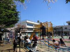 校庭の中程にいると「一輪車のサドルを高くしてください」と言ってくる子たちが集まってきました、学年が上がって体も大きく成長し、また高いサドルに挑戦したいという気持ちが湧いてきたのでしょう。また2年生なって初めて遊べるようになったアマゾンジャングルでは「全部できるんだよー見ててー」「昨日もやったんだー」と、また雲梯の順番待ちをしている児童からは「がんばれー」「あっ、(ポシェット)落ちたー」「(拾って)持っててあげようー」との声が聞こえてきました。