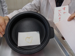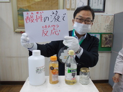廊下では各グループがお店やさんごっこのように「色が付きますよ。やってみてください。」「楽しいですよ。」「シールを貼ってください。」等の声があがり、実験を通してグループの説明が理解できたら「なるほどシール」がボードが貼られていきました。