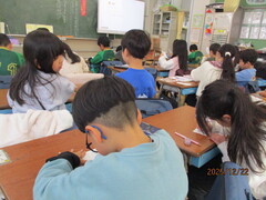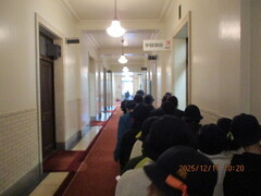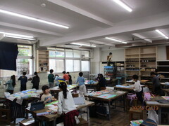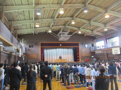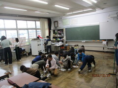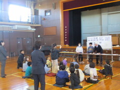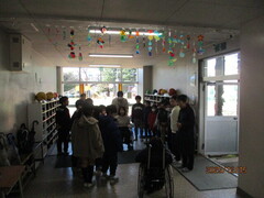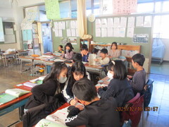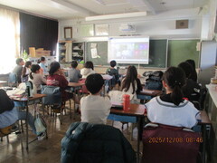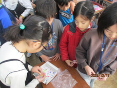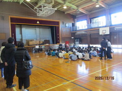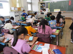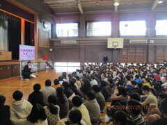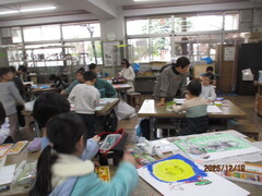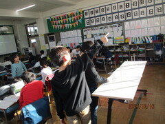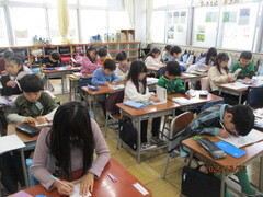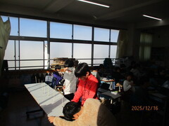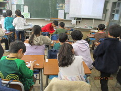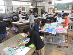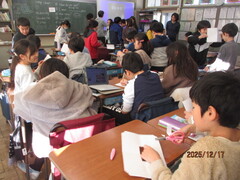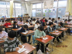 1、2年生は冬休みの宿題にもなっている「硬筆かきかた」の練習に取り組んでいました。教室は私語がなく、お手本を真横に置いて1字1字を丁寧に書く鉛筆の音だけが聞こえました。3年生は「毛筆習字」の練習―3年生にとっては初めての毛筆でのかきぞめを机上でまた床で行っていました。4年生は早くも大掃除―仕事分担をして声を掛け合っていました。5年生は学芸会の振り返り、そして6年生はSC科学習の「評価」を行っていました。実験方法は適切であったか、条件制御、比較は適切に行えていたか―等―6年生は各自が「卒業研究」に取り組み、3学期もさらに研究を深めます。また体育館で、教室で「2学期がんばったね会(お楽しみ会)」を行っている学級もありました。