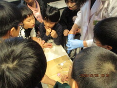 見学児童の中には、テープの受け渡しだけでなく、新しいテープを頭(額部)に貼ってあげる姿も見られました。
