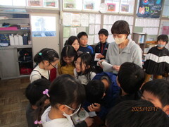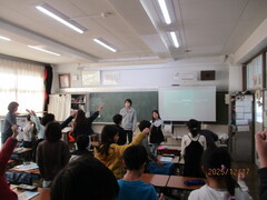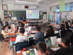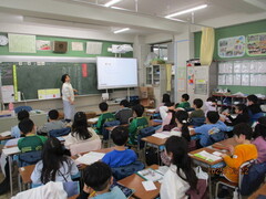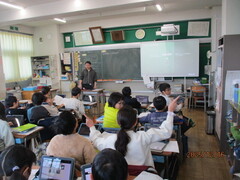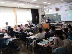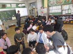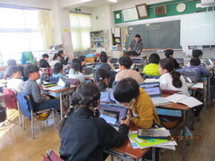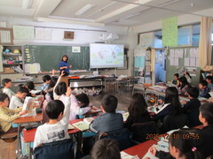 昨年度までは全校を2回に分けて行いましたが、今年度は3回に分けて行いました。時間は今回の方が短くなりましたが、1クラス平均3、4のグループに分けて「少人数制」となったため、より密度の濃い交流が行われました。教室を移動する留学生たちからは「(児童たちが)アクティブー」「グー」という言葉や満面の笑みがあふれていました。各教室の様子を覗くと・・・
