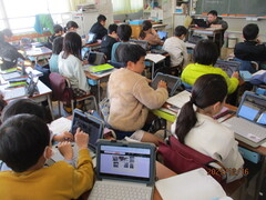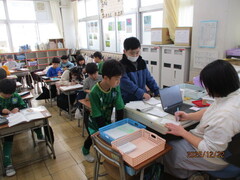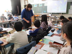 今日は挨拶、日時、曜日、時間、天気を英会話の中で行い、今日の学習ではまず様々なたくさんの色、形、大きさの紙片が用意され、それを使ってグリーティングカードを作るという話がありました。カードづくりでは「画用紙を半分に折り・・・」と説明が始まると「半分に折るって、なんていうんだ」とタブレットPCで調べる児童がいました。そして「お店屋さんごっこ」のように児童同士で会話を進めるための話型が示されるとすぐに隣席の友達と練習をする児童が見られました。