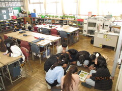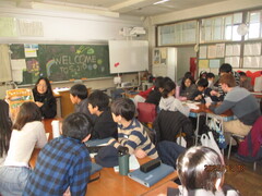 交流の中で、地球儀を用意したり、地図を用意したり、中には自分のグループに来る留学生の「国」についての本を用意して、気になったところを読んだり質問したりしている様子見見られました。