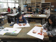 仕上がった作品はタブレットPCで写真を撮り、電子黒板に映して学習の振り返りをしました。