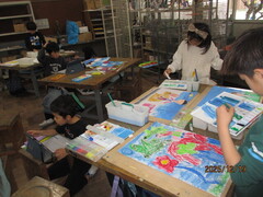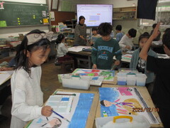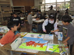 「夢の中で動物、生き物に出会ったときにどのようにして一緒にいるかを大きく詳しく描く」という内容、めあてで学習が進みました。前時からの継続学習のため、授業開始後、間もなく個別の活動が始まったようでした。児童たちはクレパス、水彩絵の具、ペン等を使って作品に向かっていました。児童たちと作品の「世界」について聞いてみると・・・