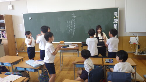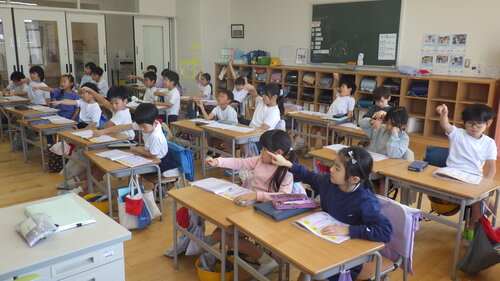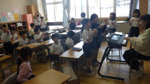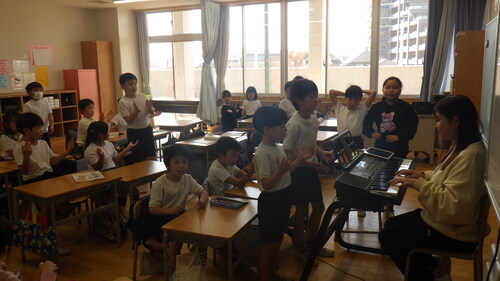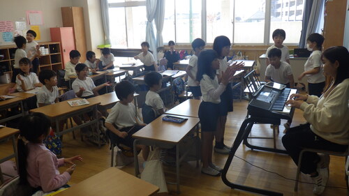 もう一つのクラスでは、「いるかは ざんぶらこ」という3拍子の曲に合わせて、拍にのって手拍子を打つ学習をしていました。