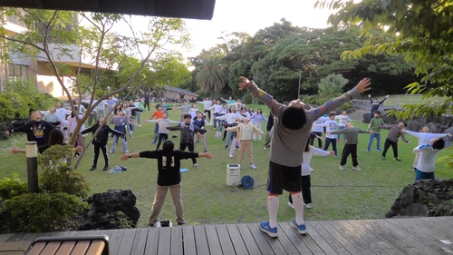 伊豆の朝日を浴びながらラジオ体操。