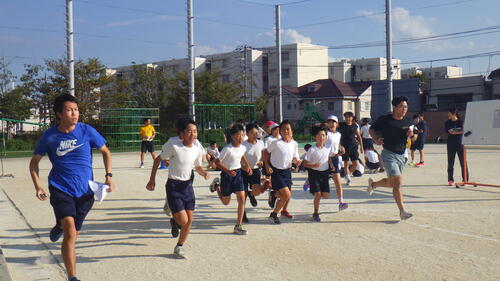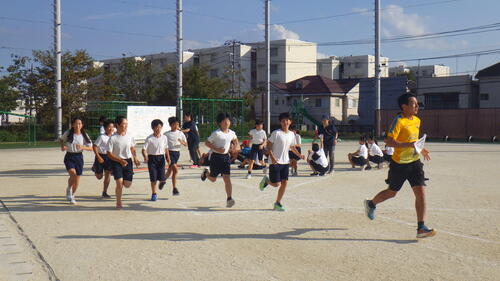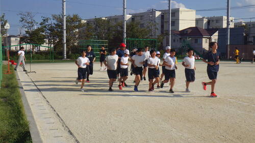 駅伝の練習の様子を紹介します。 今日は、昨年度の駅伝チームのメンバーだった中学生が、練習に参加してくれました。 秋晴れの下、涼しい風が吹いていたので、走るのにはよいコンディションでした。 大きな円になってのウォームアップで練習開始。 設定したタイムを基準に、安定した走りをすることを目標に取り組みました。 チームのメンバーの走り、表情、目つきから、自分の力を高めようという気持ちが伝わってきました。