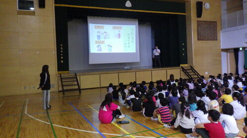 全校朝会の校長講話では、5年生の社会科見学や1・2生の生活科見学に関わる電車に乗る際のマナーの話をしました。