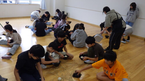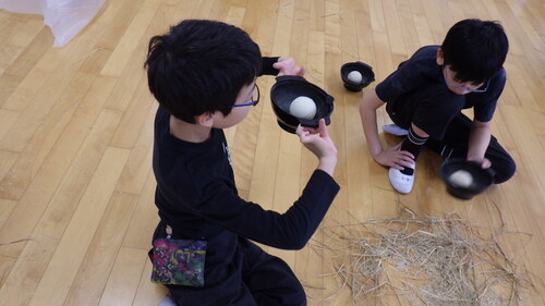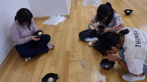そして、今日は、パルシステムさんに御協力いただき、すり鉢(米磨きボウル)とボールを使って、脱穀体験をしました。