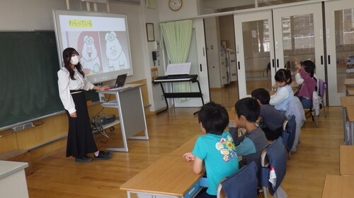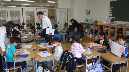 先生が分かりやすい例を出して説明した後、ワークシートに書かれた言葉の反対の意味の言葉を考えました。