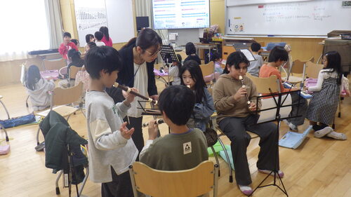全体で合奏をしたときは満足気でしたが、他の楽器との音の重なりを聴いて、さらによくしようという意見が出ました。