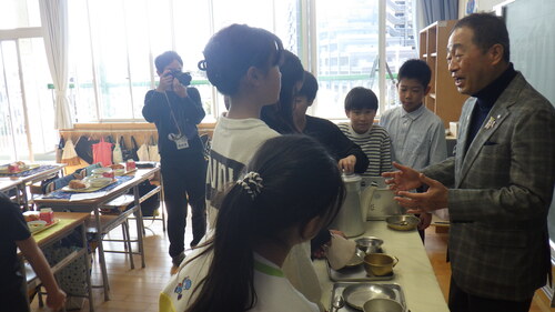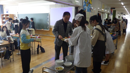 配膳にも参加して、区長さんがこどもの頃の給食の話をしてお話してくださいました。