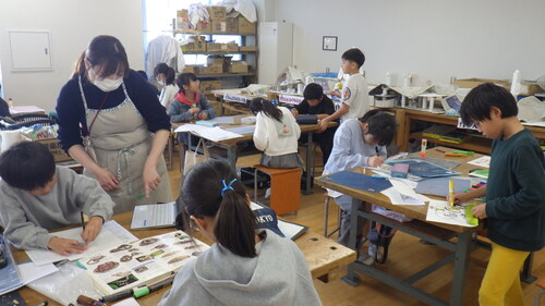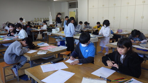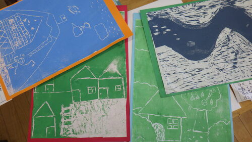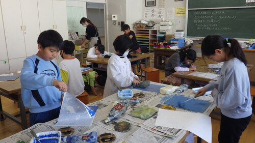 その後、こちらのクラスは、図工室で版画の作品を制作しました。