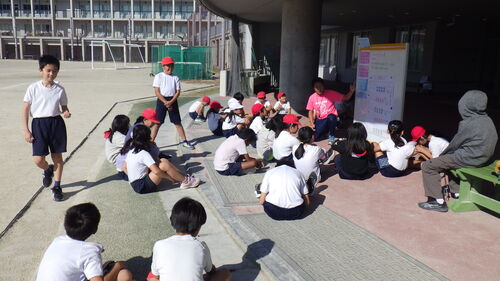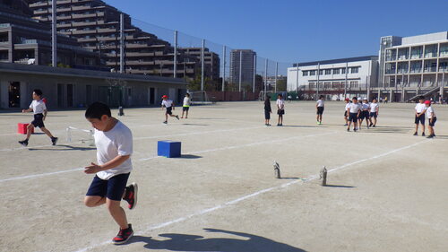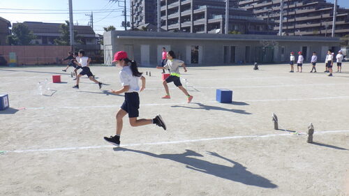 その後、このクラスは、体育の時間には、小型ハードル走で、課題別に学習をしていました。(いろいろ考えたり工夫したりしながら何度も走っていました。)