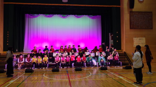 ひな壇にいるときも、振り付けで劇を創る練習をしている1年生。