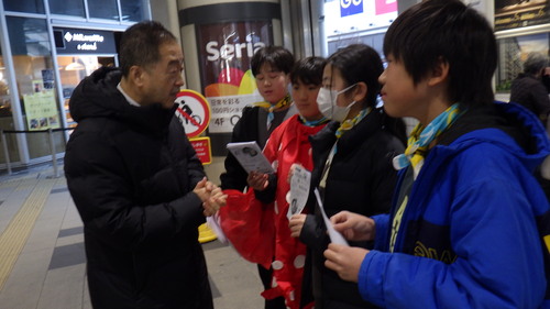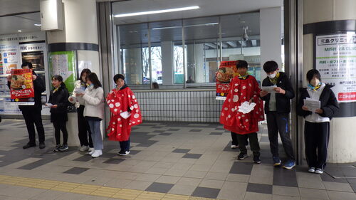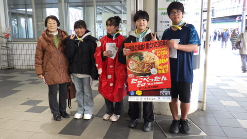 今日の活動内容は、「たこぺったんそば」のプレスリリースに伴う取材対応、駅構内の放送での宣伝、改札口前でのチラシ配りとアピールです。