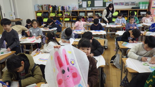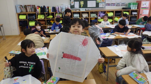 1年生が凧づくりをしました。(明日、飛ばす予定です。)