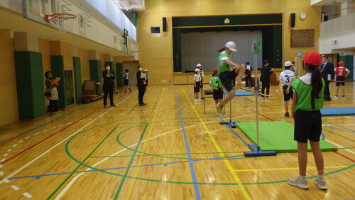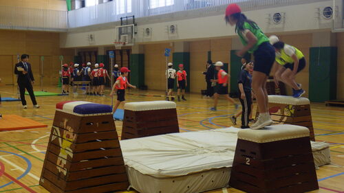 「自分やチームの良さや課題を見付け、伝え合うこと」をめあてに掲げて、「跳び箱飛び乗り」「ろくぼく2本ゴム跳び」「リズム助走」で感覚づくりをした後、自分の課題解決に挑みました。