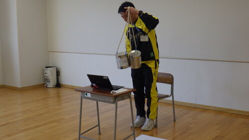 週番の先生からは、使った物を元に戻す話や主事さんが作ってくれた遊具の紹介がありました。(大きな缶にひもを通して、そのひもを掴みながら缶に乗って歩く遊具です。)