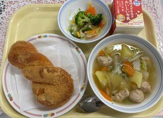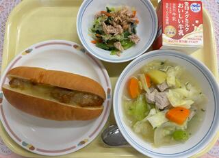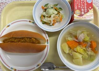 ひとこと:今日は、4年生が社会科見学に行きました。天気に恵まれてよかったですね。今日の主食は、コッペパンに豚肉、にんじん、たまねぎを入れて作ったミートソースをはさみ、チーズをのせてオーブンで焼きました。スープは具だくさんのポトフです。味わっていただきましょう。