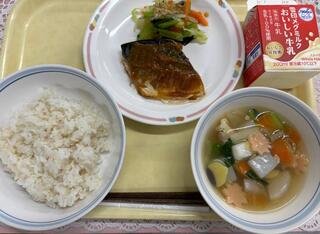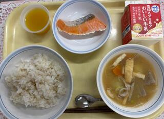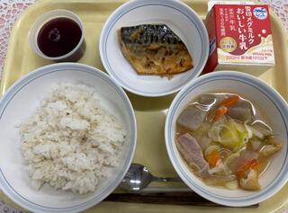 献立:ごはん 牛乳 さかなの香味焼き 豚汁 ぶどうゼリー
