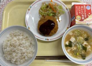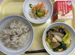 ひとこと:今日は、米粉が入ったシチューです。豆乳も入っているので、いつものシチューに比べてあっさりとしています。具は鶏肉、にんじん、たまねぎ、じゃがいも、マッシュルームが入っています。味わって食べてくださいね。サラダにはごぼうやさきいかが入っているのでいつも以上にかんで食べることを心がけましょう。