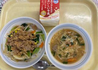 献立:中華丼 牛乳 にらたまスープ しゅわしゅわフルーツポンチ
