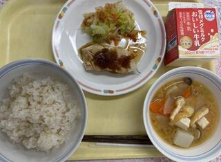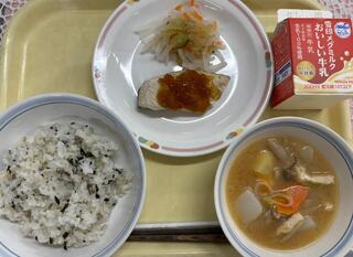 献立:ごはん 牛乳 魚のねぎソースかけ おかか和え 味噌けんちん汁