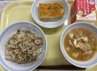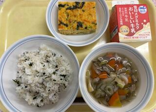 献立:わかめごはん 牛乳 切り干し大根の卵焼き 根菜汁