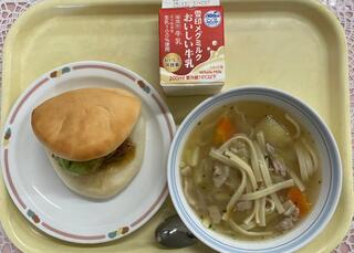 献立:照り焼きチキンバーガー 牛乳 ヌードルスープ