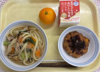 献立:五目うどん 牛乳 たこぺったん くだもの