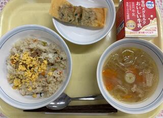 献立:卵入りチャーハン 牛乳 棒餃子 春雨スープ